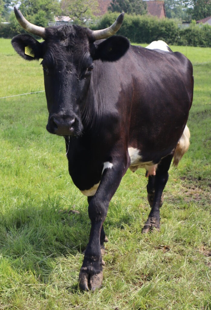 The Gloucester cattle are an ancient breed who once were on the verge of extinction. Famed for their large sweeping horns, dark colouring and white stripe running down the back and hind legs, these dual-purpose cows are good mothers.